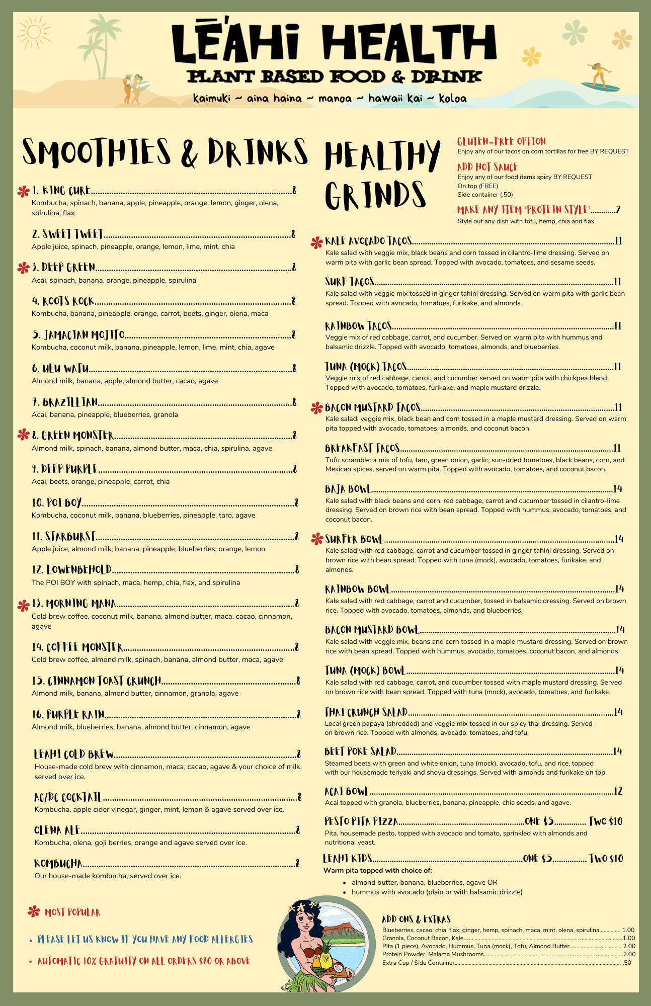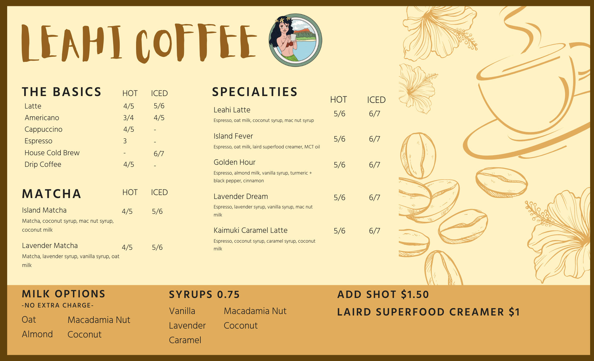 I redesigned Leahi Health’s food and drink menu to reflect the brand’s hip, beachy aesthetic. The coffee menu (pictured below) is my original creation—I developed it from scratch, crafting the drink names, recipes, and pricing.